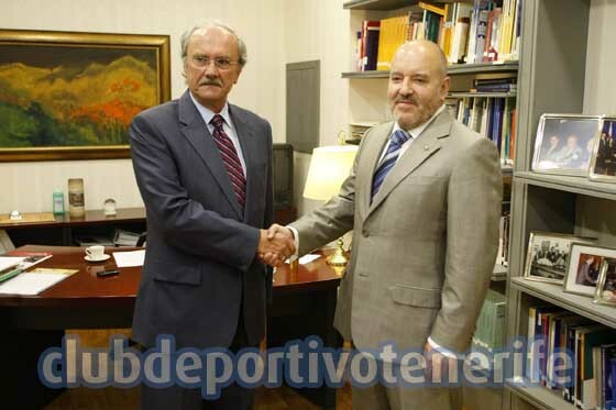 El presidente del CD Tenerife, Miguel Concepción; y su homólogo de la Confederación Provincial de Empresario de Santa Cruz de Tenerife (CEOE), José Fernando Rodríguez de Azero, comparecieron este martes ante los medios de comunicación, una vez concluyó el